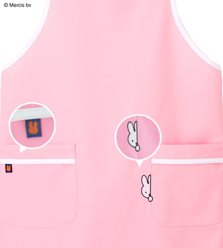 ポケットの端から覗き込んだミッフィーが可愛らしいエプロンです。ポケット口に挟み込んだブルーの織ネームもポイントになっています。白の配色パイピングとミッフィーの白さが統一感をだし、新鮮な雰囲気です。