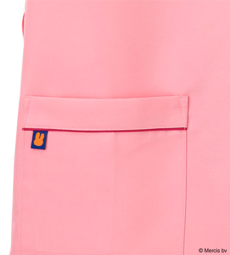 ナガイレーベンのミッフィーシリーズの白衣。 ディック・ブルーナの絵本に使用されている可愛いモチーフを胸元に刺繍し、衿元、ポケット口に配色のコードパイピングを挟み込みました。 大人っぽい配色で、いままでにない雰囲気のスクラブになっています。ポケット口に挟み込んだブルーの織ネームもポイントになっていておしゃれ。