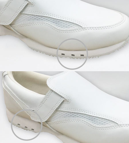 このシューズは、室内での使用を前提に開発した商品です。通気孔となっているメッシュ部分および底から水が入る場合がありますので、室外および室内でも水分の多い場所でのご使用はお控えください。