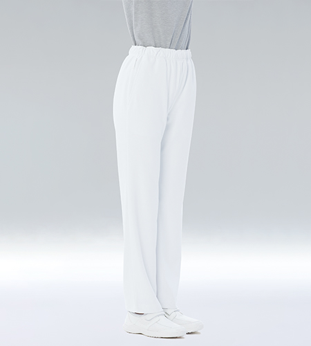 抜群のストレッチ性を誇るニット素材の男女兼用パンツ。防透性・通気性・制菌加工によって長時間の着用でも清潔で快適な着心地が続きます。