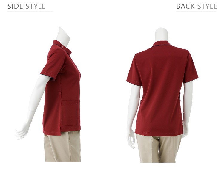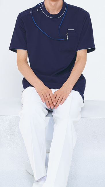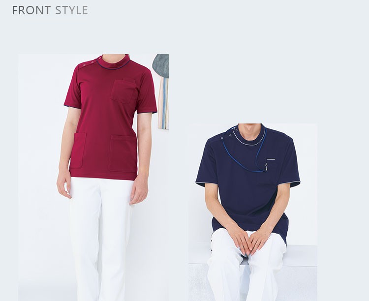 より動きを要する日常業務において、動きやすいストレッチ性と涼感機能を持った素材を活用し、ポロシャツ感覚で着用できる専門性の高いケーシータイプのデザインです。ベースカラーの濃色はご利用者さんにとって標識性を高めると共に、温もりのある環境色にとても馴染むカラーリングです。