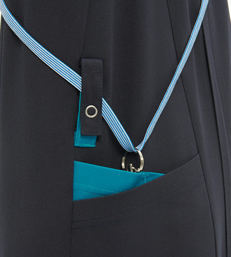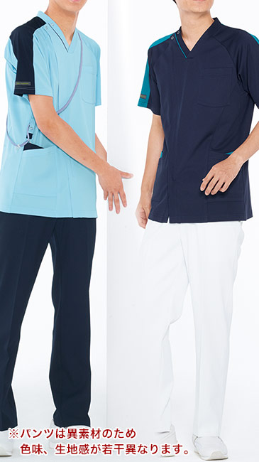 アシンメトリーなデザインがカッコよさを印象づける男性用スクラブ白衣。伸縮性豊かな接触冷感ニット素材に加え、腕の可動範囲を広げる脇のカットで快適なお仕事をサポート。業務用洗濯にも耐えうる形態安定素材で衣服が長持ちするのも嬉しい!