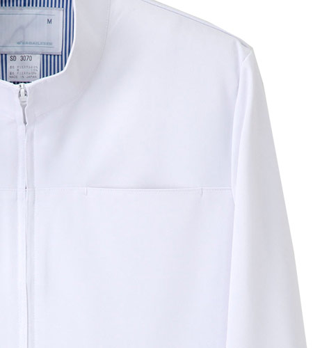 フロントファスナーのカジュアルタイプのコートです。爽やかストライプの裏地仕様(背抜き)。立ち衿でファスナー付きなので、患者さんに直接髪の毛が当たらずに作業出来ます。左胸ポケット
