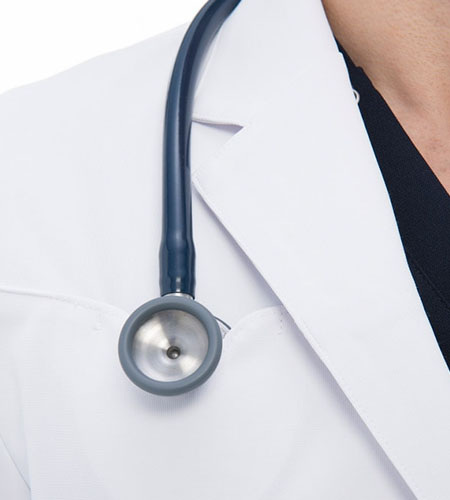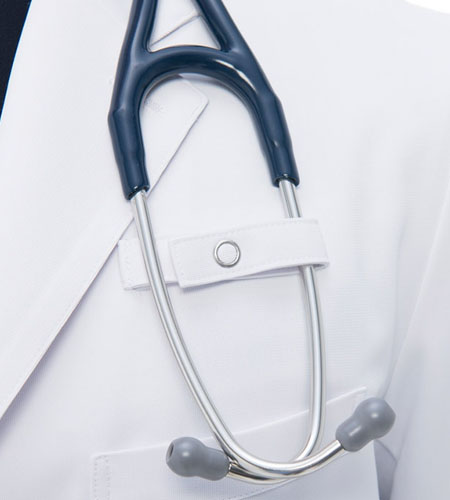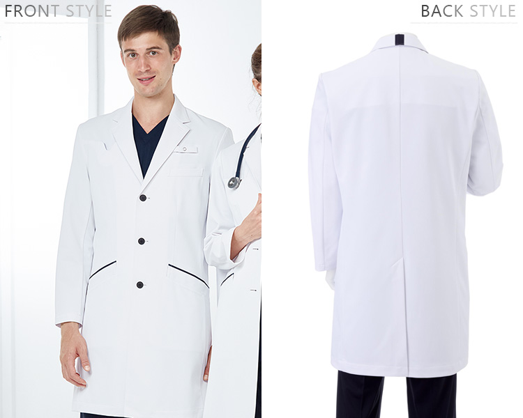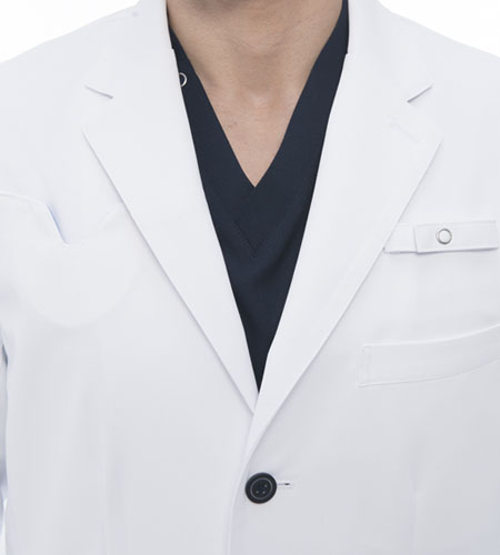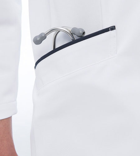 聴診器専用ポケットを備えた男性用ドクターコートです。両腰のポケットも聴診器がしっかり収納できる工夫がされています。