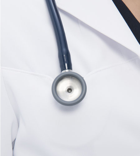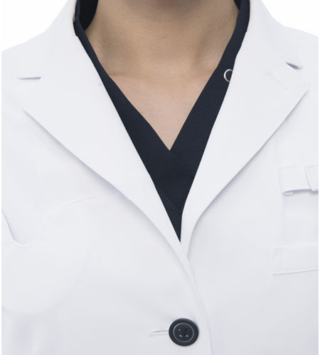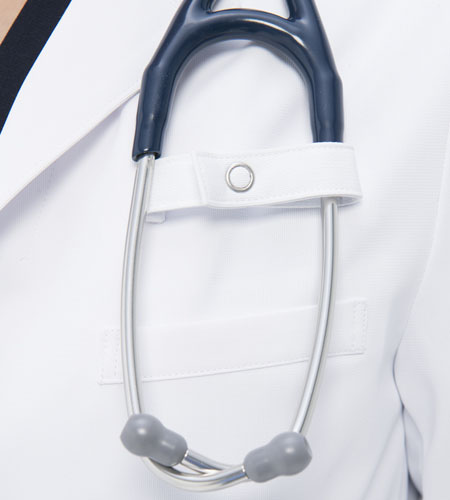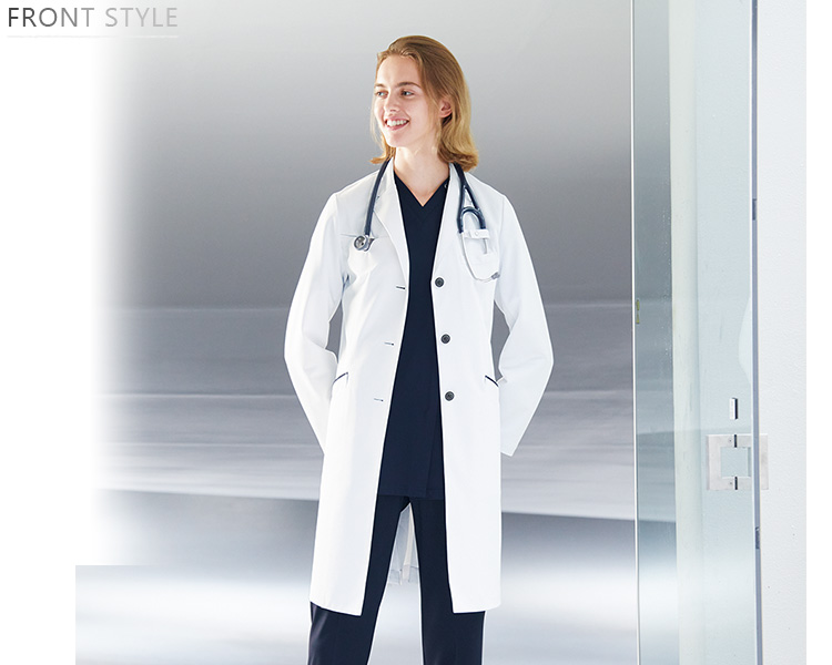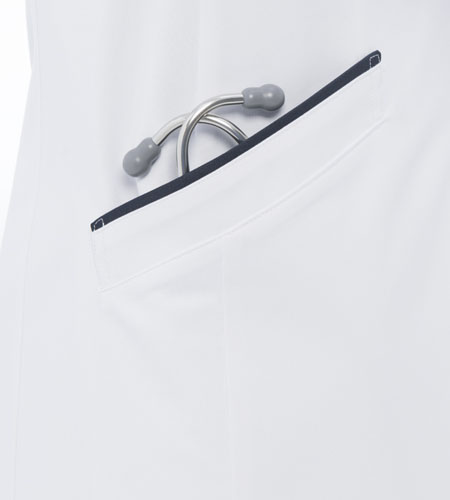 聴診器専用ポケットを備えた女性用ドクターコートです。両腰のポケットも聴診器がしっかり収納できる工夫がされています。