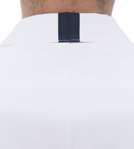 後ろ襟にネイビーのアクセントがお洒落な印象。