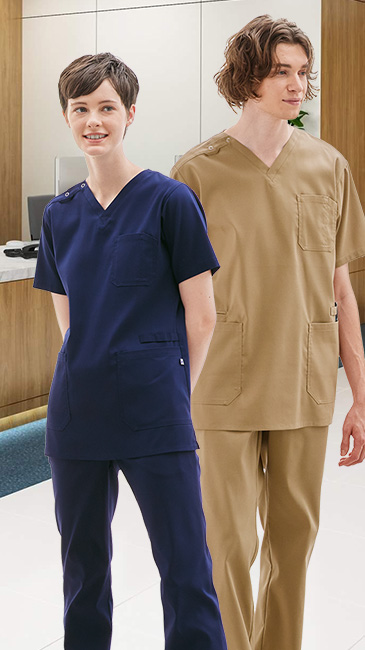 環境に優しい素材サスティナブル新素材を使用した、かぶりタイプの男女兼用スクラブ。洗うと風合いが増すカジュアル感ある雰囲気。ストレッチ性も高く快適な着心地です。