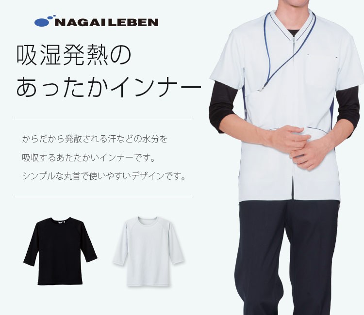 ナガイレーベンの男女兼用インナーTシャツ。からだから発散される汗などの水分を吸収しあたたかく快適です。 シンプルな丸首で使いやすいデザインです。