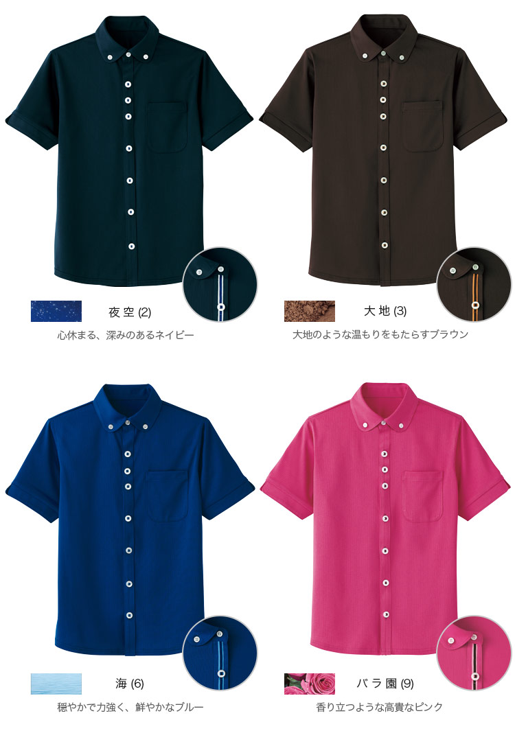 トレンドのパラシュートボタンを採用し、より安全で便利な作りです。ラウンドデザインの襟にボタンダウン仕様でさらにおしゃれ度をアップ。介助時もきちんと感が続くシャツです。