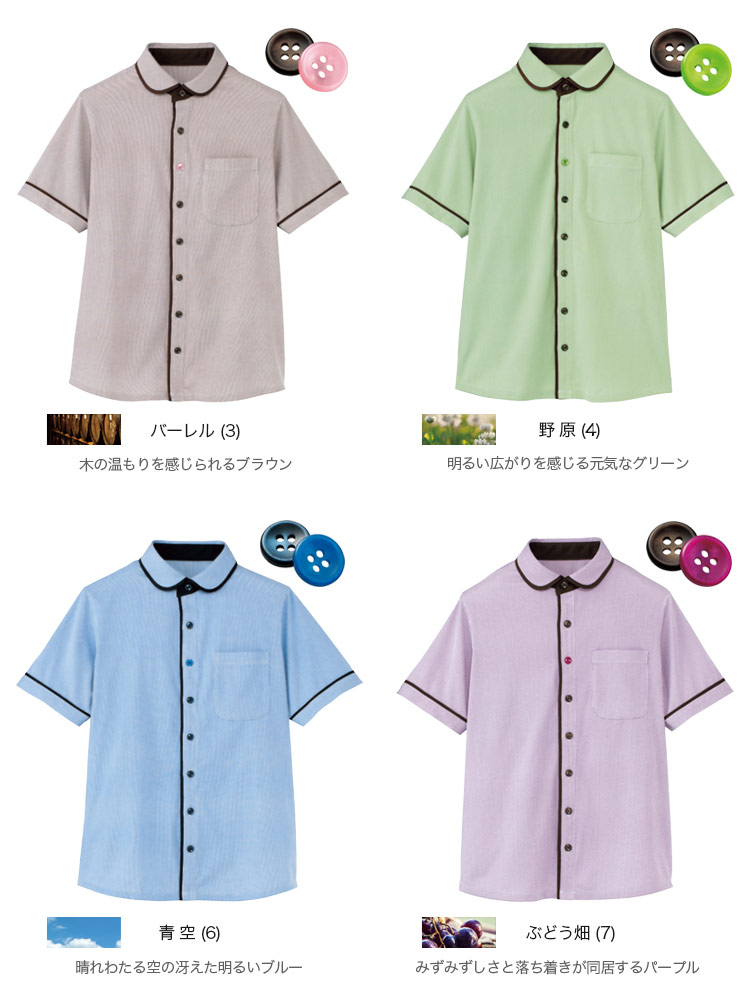 胸元のボタンの色使いを変えることで、おしゃれなワンポイントになり、会話のきっかけをつくります。ジューシーなナチュラルカラーがアクセントになっています。動きやすいARM360°