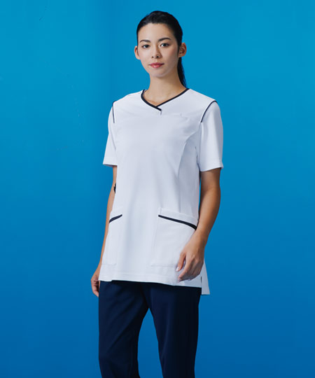 動体裁断の4D構造なので、どこまでもスムーズで美しいシルエット。斜めに入った配色がすっきりしたスクラブです。高い機能性を確保しつつ、これまでにない動きやすさを実現しています。