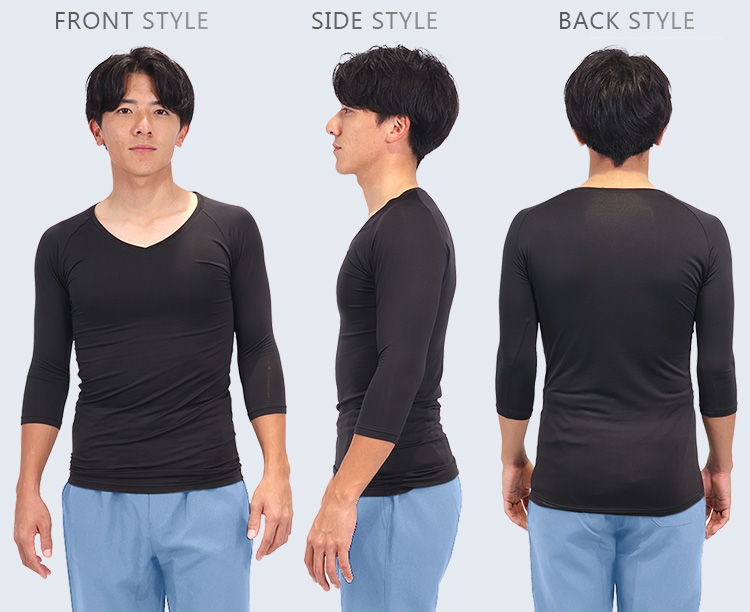 蓄熱保温素材の裏起毛メンズスクラブインナー。薄いのにあたたかい高機能な防寒インナー。七分袖で動きやすい。