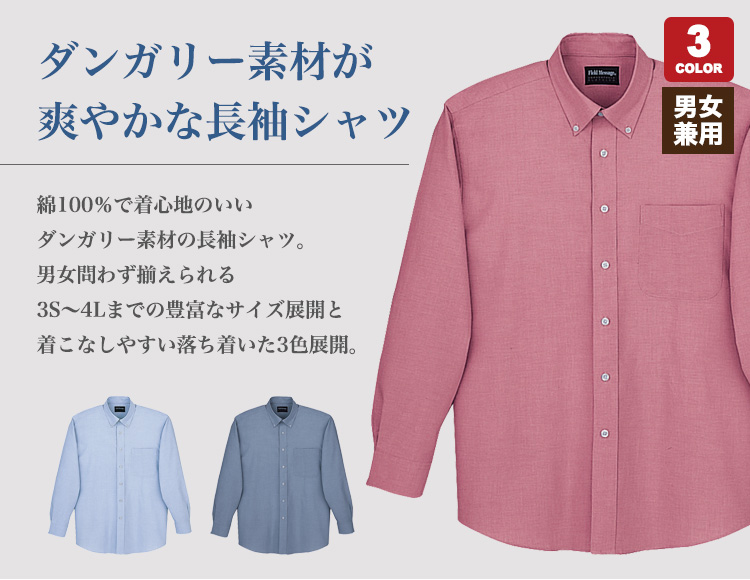 ダンガリーのカラーボタンダウンシャツ、3色のカラーバリエーション。 男女兼用でサイズ豊富SS~4Lまで。 半袖タイプもあります。