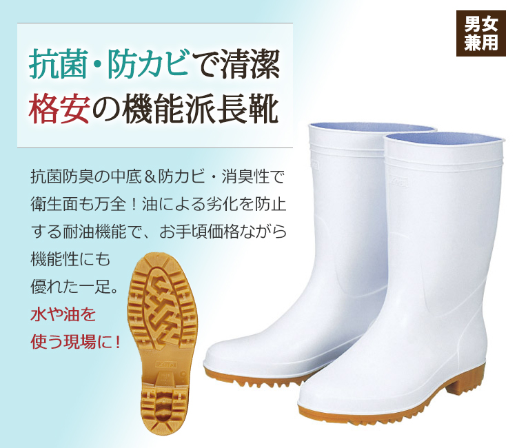 水や油を扱う作業環境に最適!抗菌・防カビ機能搭載で快適な衛生長靴。