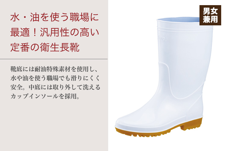靴底には滑りにくい耐油特殊素材を使用し、安全性を向上させています。