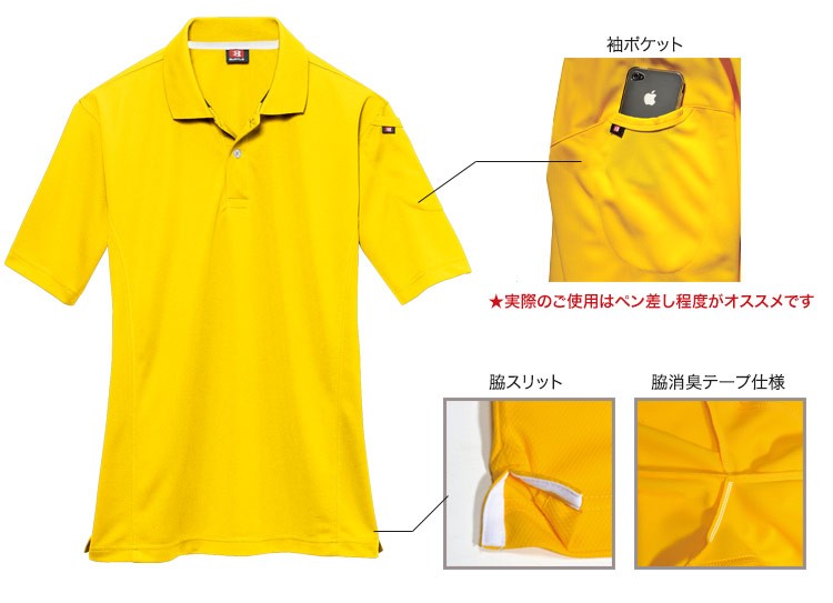 汗のベタつきを防ぐ吸汗速乾機能と不快なニオイを抑える消臭テープを脇部分に採用。作業の邪魔にならない袖ポケットも付いた、機能性抜群のアイテム。シンプルながらもおしゃれにコーディネートできるデザイン性にも優れたポロシャツです。