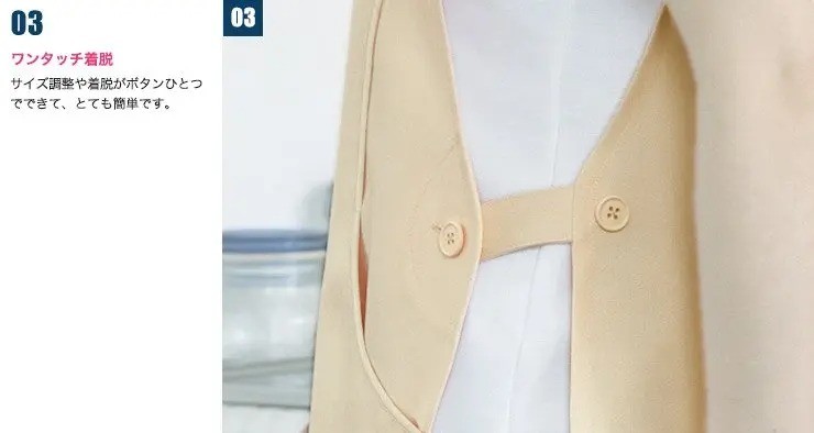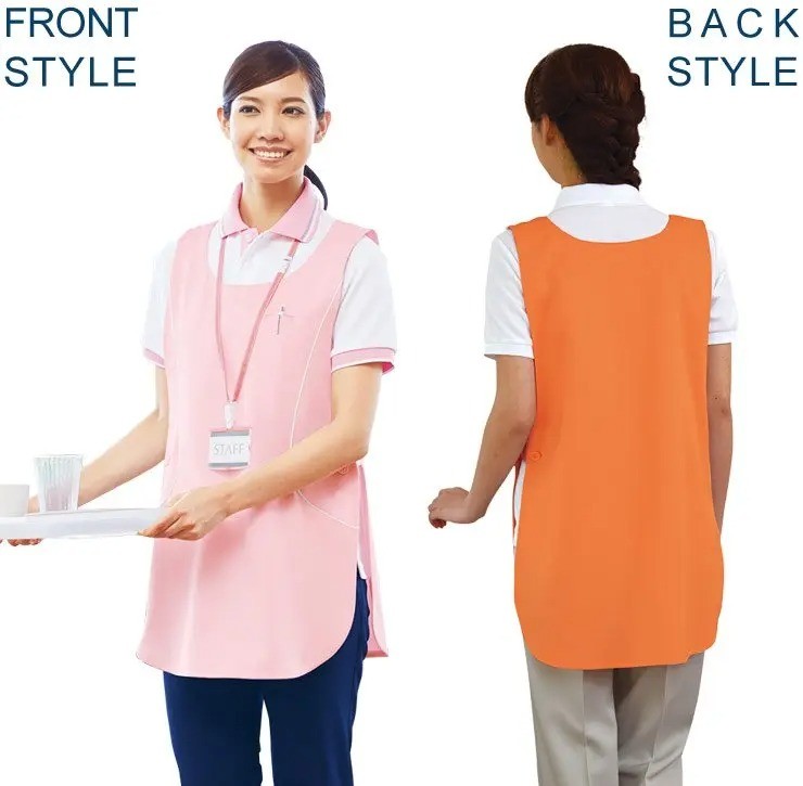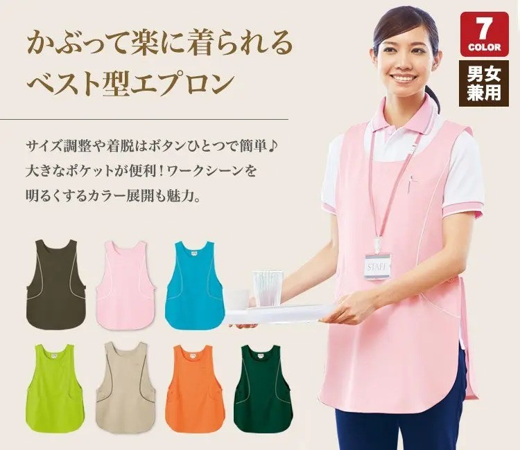 かぶるだけでラクラク装着のベスト型エプロン。ウエストのサイズ調節もでき、幅広い体型の方に対応。