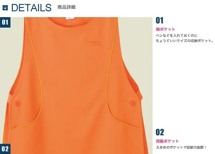- ペン差しポケット付き左胸ポケット、両脇ポケット、ウエスト調節可