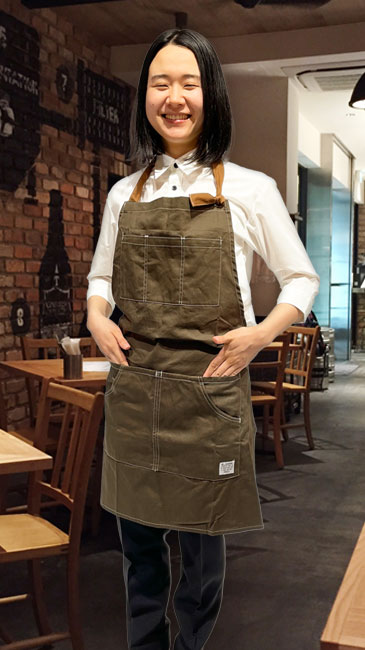 首紐・腰紐の配色やネームタグがアクセントのおしゃれな胸当てエプロン。一枚着用するだけで一気にカジュアルな雰囲気にキマります。