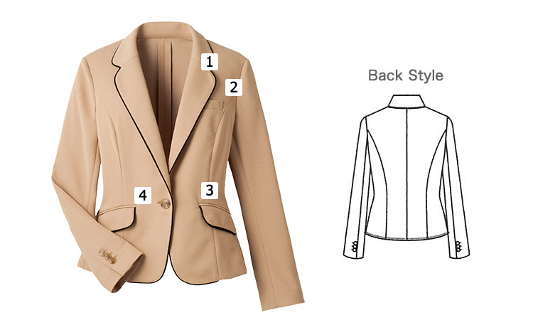 やわらかな曲線を活かしたデザインがより引き立つ、パイピング使いの裏なしジャケット。 軽くて着心地のよいストレッチ素材を採用。 ワンピースやベスト、パンツなどシーンにふさわしいアイテムと合わせることで、信頼感のある印象を与えます。