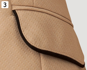 襟元から裾、ポケットにあしらわれたパイピングが、フェミニンな印象を引き締めます。