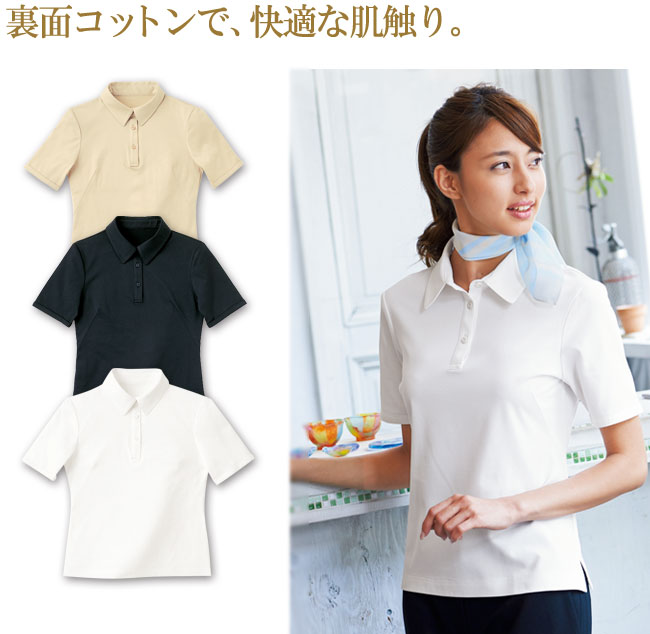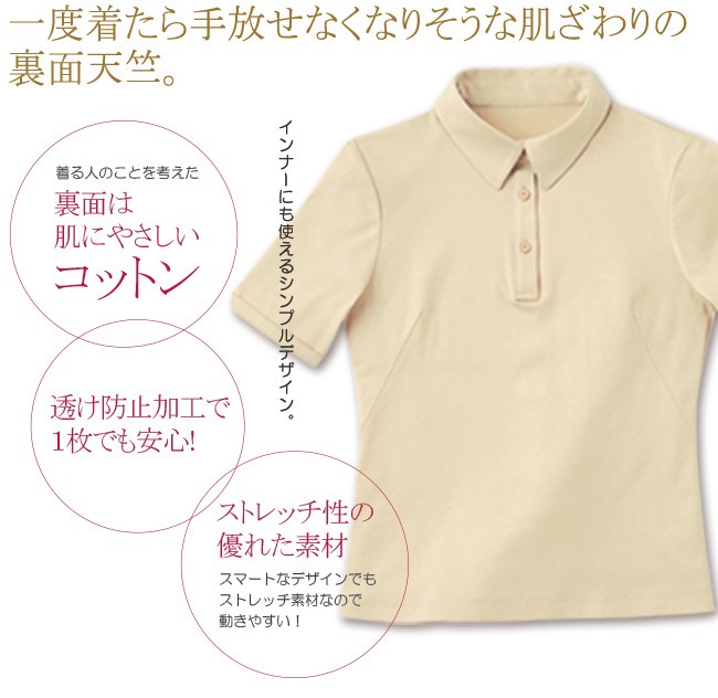 コットンのさわやかな肌ざわりとポリエステルのお手入れしやすさが調和。 吸汗性と速乾性に優れ、洗濯機もOK。ノーアイロンで着用できます。女性に安心な透け防止が加工されています。