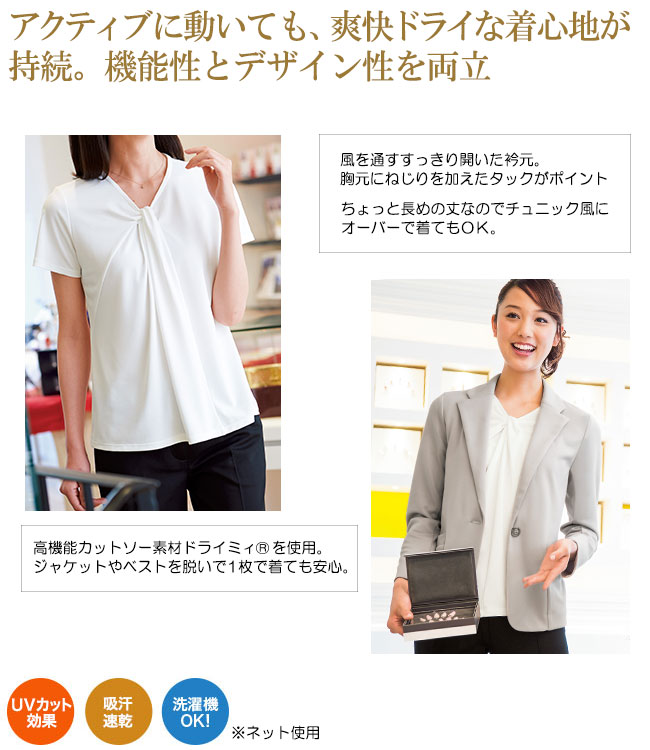 胸元にタックを加えたデザインがポイント。ちょっと長めの丈なのでチュニック風にも着こなせます。