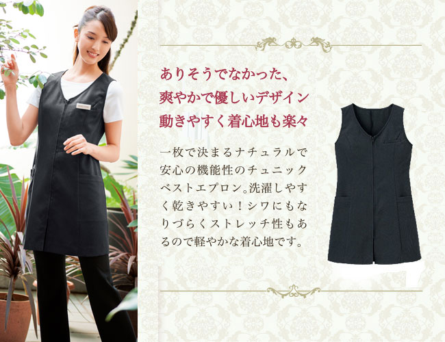 一枚で決まるナチュラルで安心の機能性のチュニックベストエプロン。洗濯しやすく乾きやすい!シワにもなりづらくストレッチ性もあるので軽やかな着心地です。