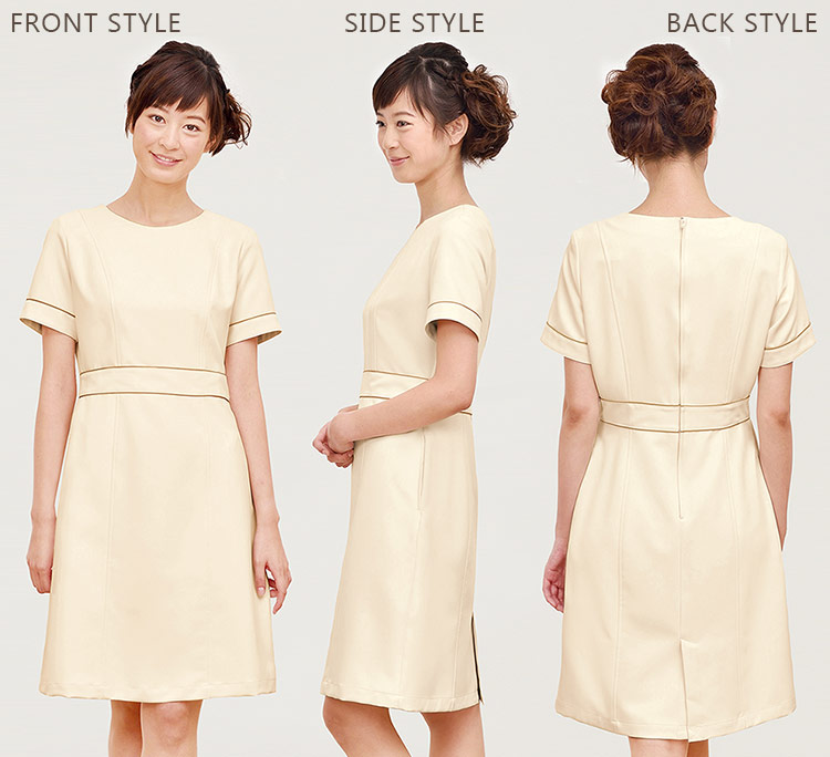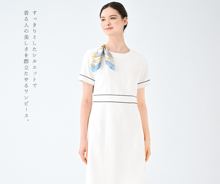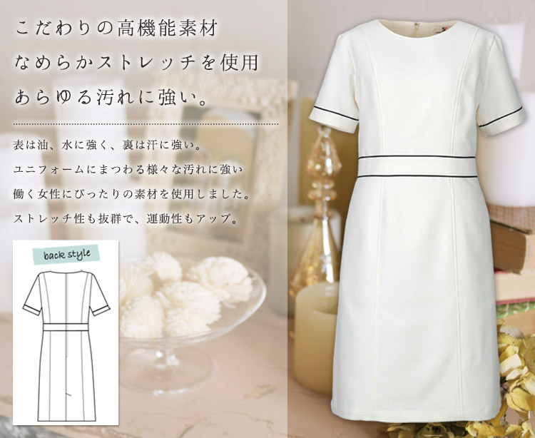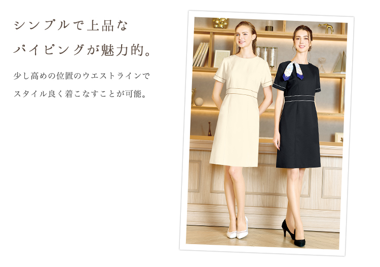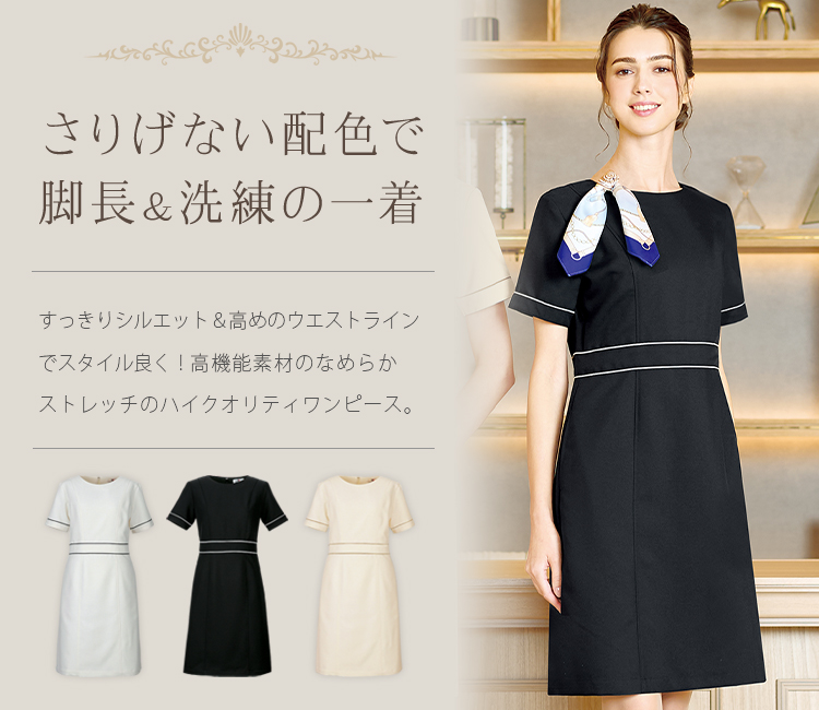 こだわりの高機能素材、なめらかストレッチを使用したハイクオリティワンピース。すっきりとしたシルエットに配色カラーのパイピングがポイント。少し高めの位置にウエストラインがあるので、スタイル良く着こなせます。