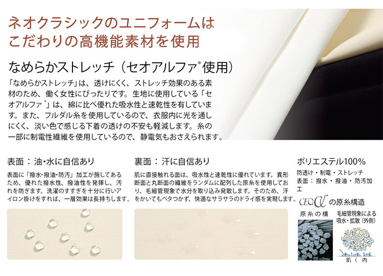- 制電、ストレッチ、透け防止、吸汗速乾、防汚、撥水、撥油