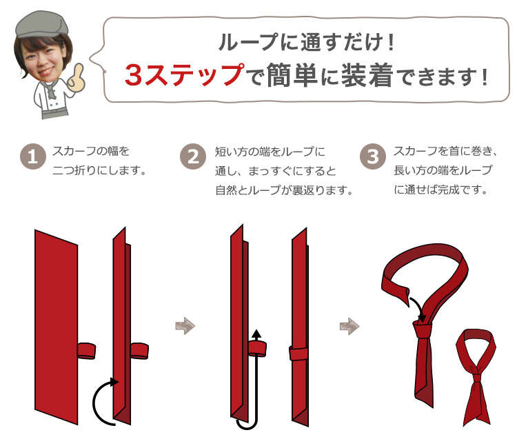 コーディネートのワンポイントになるスカーフタイ。ループに通すだけで簡単に装着できます。