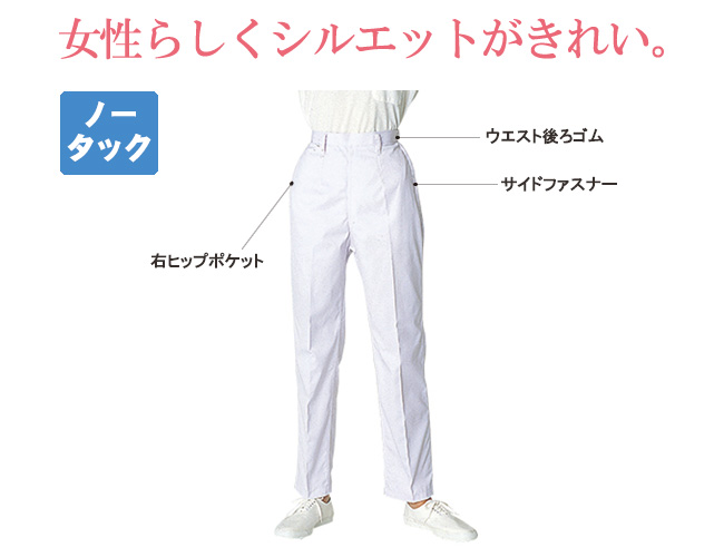 ノータックの女性らしいシルエットの厨房パンツ。