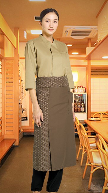 東京の名店「すし 久遠」とチトセのブランド「dradnats」の共同開発。動きやすさと上品な美しさを兼ね備えた腰下エプロン。切子柄と無地の切り替えがポイントの右前のスリットで足さばきが楽なイージーケアのロング丈のエプロンです。