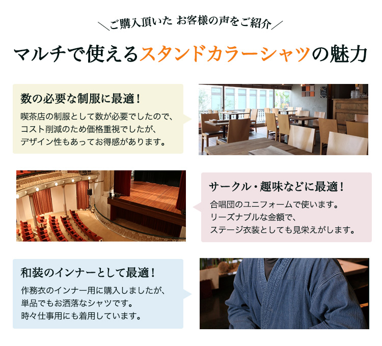 当方は旅館ですが、スタンドカラーなので和の雰囲気の中でも違和感なく着用出来ます。