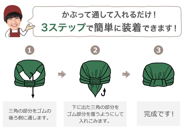 後ろゴム仕様で結ぶ必要がなく、ワンタッチで着用できます。準備の時間を短縮して効率アップ!