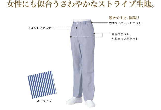 女性にも似合うさわやかなストライプ地のイージーパンツ。