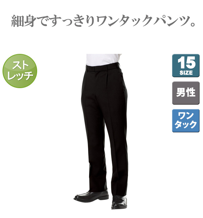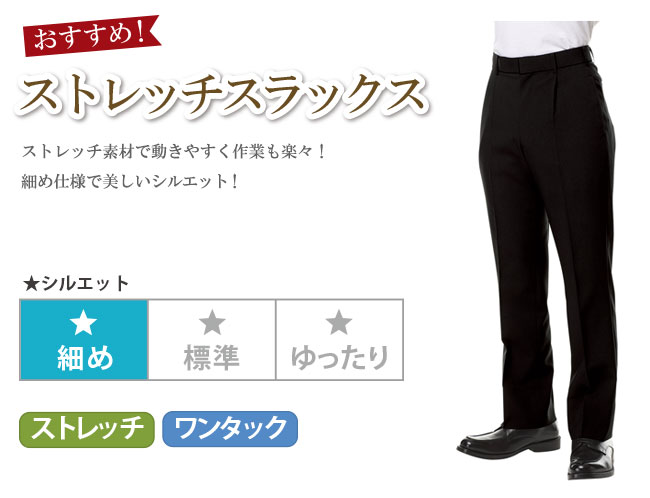 ストレッチで動きやすいスラックス。細めの仕様でスリムなシルエット!