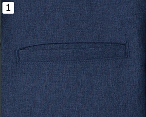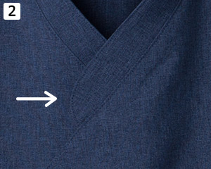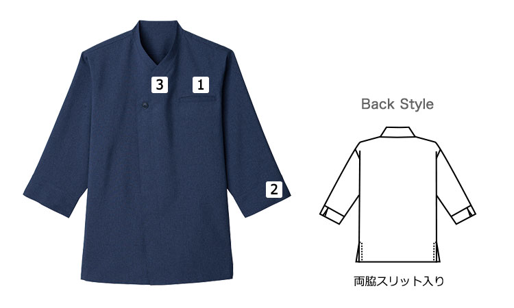 - 左胸ポケット、袖口スリット、両脇スリット、はだけ防止スナップ付、比翼ボタン