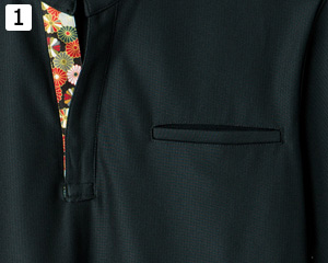 伝統色3カラーの襟元に、それぞれ異なる個性的な和柄を施しました。和空間をより華やかに演出してくれます。同じ和柄のセットアップスタイルや、シンプルなユニフォームのアクセントに1点和柄を取り入れたコーディネートがおすすめ!
