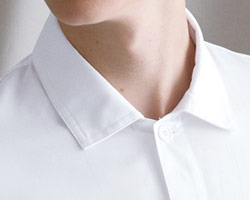浅めの襟ぐりがアンダーウェアを見えにくくし、ノーネクタイでもキリッとした印象になります。