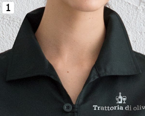 かぶりタイプの大きめのオープンカラーで、フェイスラインをすっきりと魅せます。