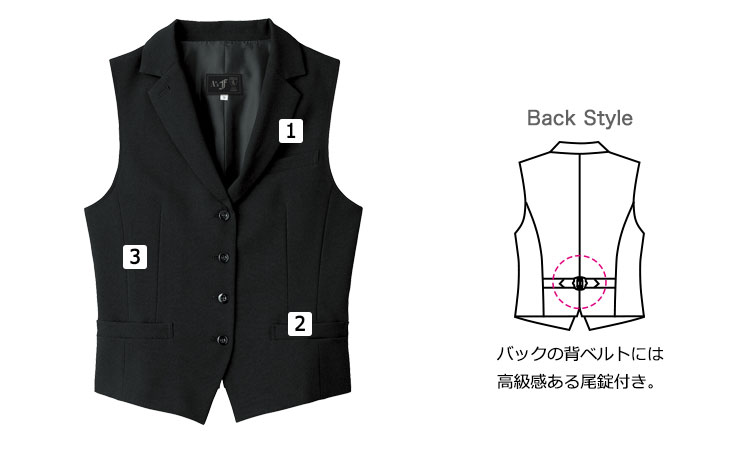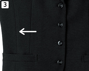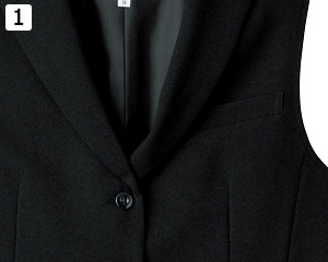 動きやすいストレッチ性のある襟付きのベストです。長時間着ていても疲れにくい着心地の良さや、洗濯した際に裏地が出ないよう襟ぐりにおさえステッチを施すなど、毎日着用する方への細かな配慮が行き届いた一枚。