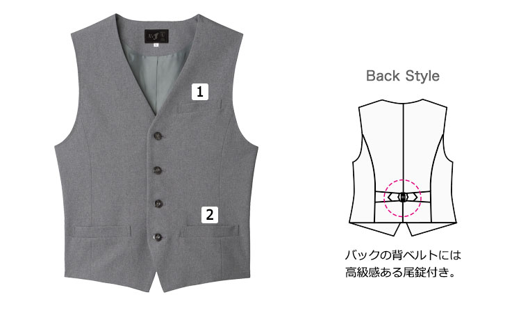 より着やすいシルエットへパターン調整をした男性用ベスト。 洗濯した際に裏地が出ないよう、襟ぐりにおさえステッチを施してあります。 ストレッチ性で動きやすく、撥水、防汚の安心の機能付き。