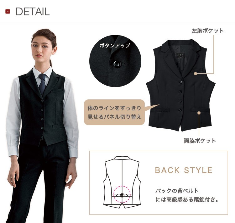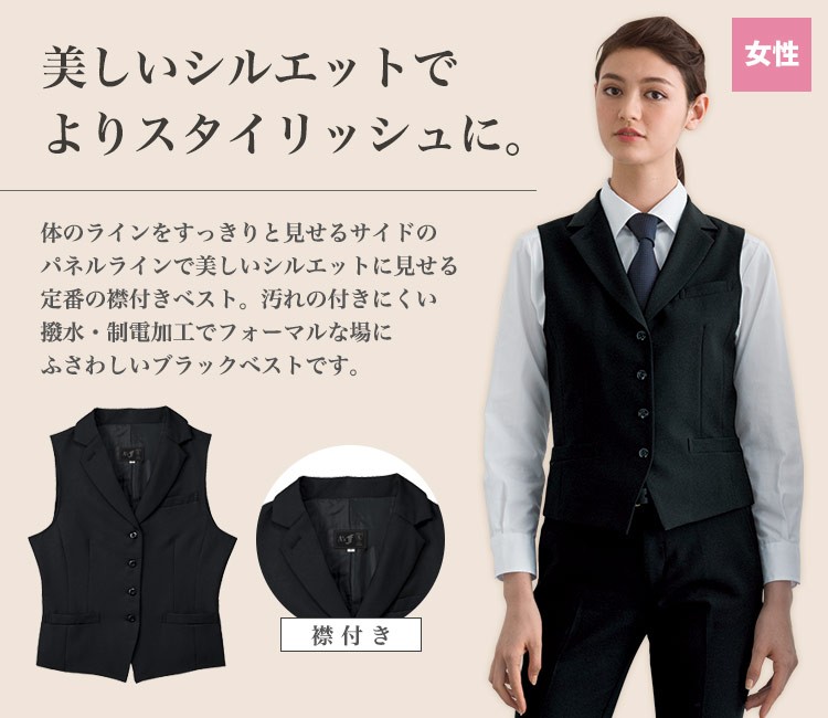 arbeのベスト。撥水・制電加工のあるフォーマルベストです。 汚れても簡単に落とせるため、日々のお手入れも簡単! 制電加工は衣服のまとわりつきだけでなく、ほこりなどの 吸着も防ぐため、清潔感を保てます。