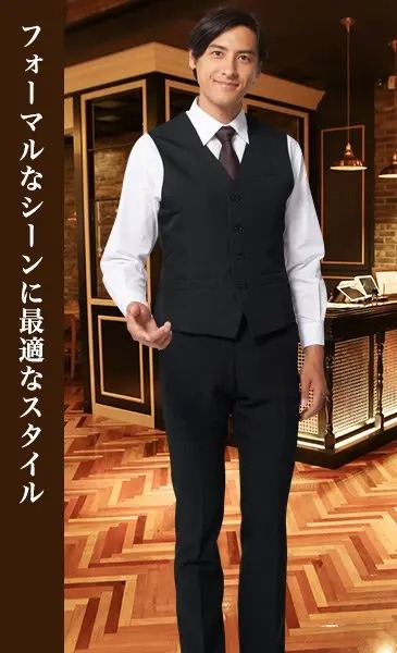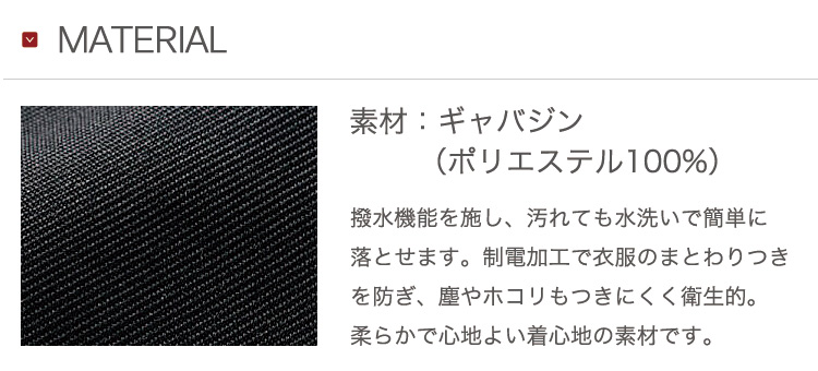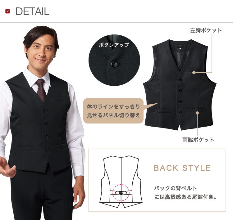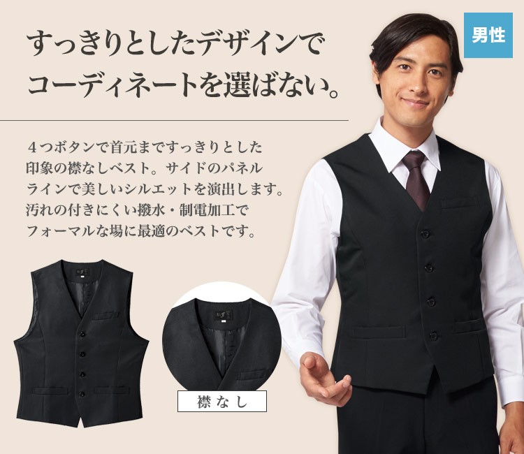 arbeのベスト。撥水・制電加工のあるノーカラーのベストです。汚れても簡単に落とせるため、日々のお手入れも簡単!制電加工は衣服のまとわりつきだけでなく、ほこりなどの吸着も防ぐため、清潔感を保てます。