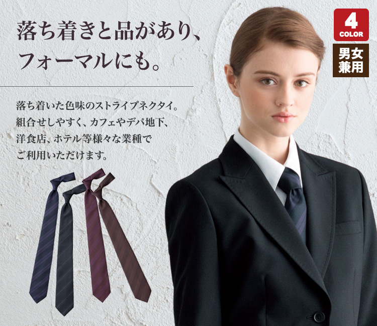 胸元を飾るストライプ柄ネクタイ。