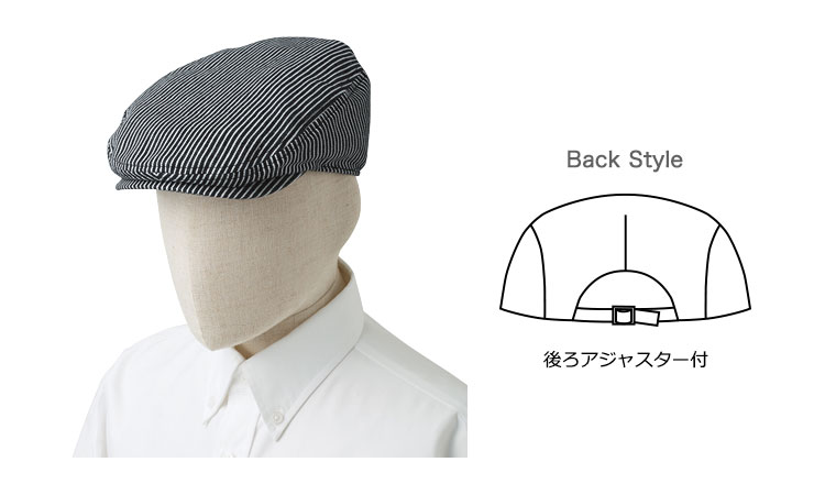 カジュアルだけど洗練された印象を与えるヒッコリー素材のハンチング。 かしこまりすぎていないラフさが、親しみやすい雰囲気を生み出します。 後ろアジャスター付きでサイズ調整が可能。被り心地を自由自在に変えられます。 オーガニックなカフェなどににマッチする私服感覚のユニフォームです。