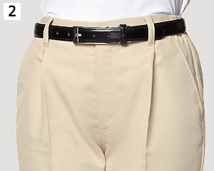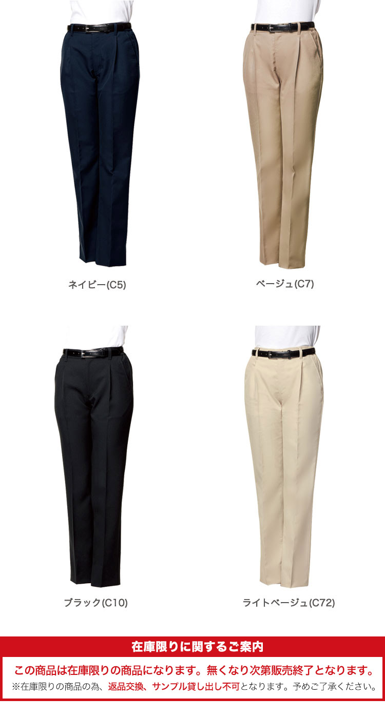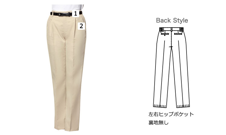 - 制電、ストレッチ、ワンタック、脇ゴム、両脇ポケット、左右ヒップポケット、裏地なし