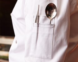 盛りつけ用ピンセットと味見用スプーン専用の左袖二重セパレーションポケット付きですぐに出し入れができ機能的です。