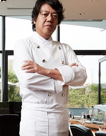 和服の左前の襟をコックコートに展開し、和のテイストを入れています。